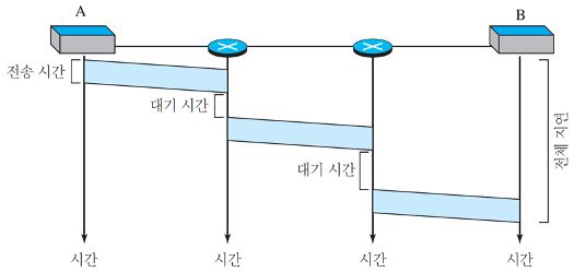 전송시간을 $T$ 라고 했을 때, 각 교환기(라우터) 마다 대기 시간이 존재한다. 그 사이 총 3번의 전송이 일어나므로 $ 3T * delay1 + delay 2 $ 가 된다.