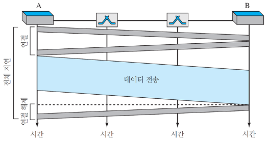 데이터그램망과 달리 교환기 사이의 지연시간이 없다. 오직 연결 설정과 연결 해제, 전송 시간만 포함된다.