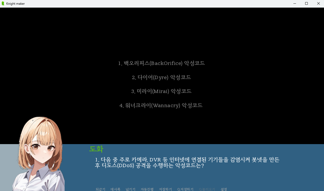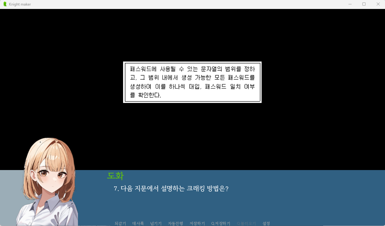 최종 결과물은 다음과 같이 정보보안기사 필기문제(100개)를 json으로 읽어서 출제하고 점수를 확인 할 수 있으며, 기존과 다르게 캐릭터의 초상화가 대화상자에 같이 나온다.