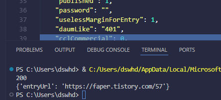 저기에 들어가는 카테고리나 그런 값들은 직접 블로그에 맞게 확인을 해봐야 하는 거라 아마 쿠키를 본인걸로 바꿔도 제대로 작동 안할 수도 있다. 꼭 본인의 환경에서 먼저 테스트를 하고 코드를 짜길 바란다.